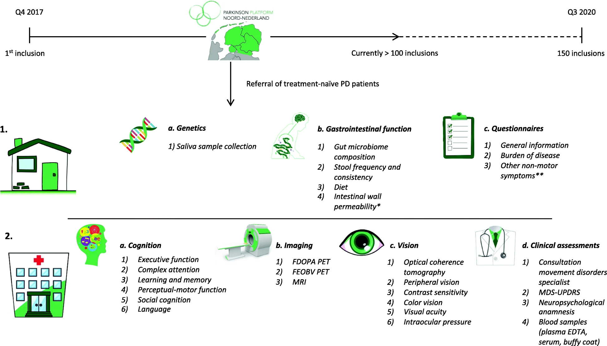 We thank all patients, caregivers, health care professionals, students and institutions who have contributed and collaborated in this project. In particular, we would like to thank Renée Speijers, Yvonne Nijman and Hanna Slomp for their help in the recruitment and logistics of the study. The Parkinson Platform Northern Netherlands (PPNN) Study Group collaborators. Verwey NA1, Van Harten B1, Portman AT2, Langedijk MJH2, Oomes PG2, Jansen BJAM2, Van Wieren T2, Van den Bogaard SJA3, Van Steenbergen W3, Duyff R3, Van Amerongen JP3, Fransen PSS4, Polman SKL4, Zwartbol RT4, Van Kesteren ME4, Braakhekke JP4, Trip J4, Koops L4, De Langen CJ4, De Jong G4, Hartono JES4, Ybema H4, Bartels AL5, Reesink FE5, Postma AG6, Vonk GJH7, Oen JMTH7, Brinkman MJ7, Mondria T7, Holscher RS7, Van der Meulen AAE8, Rutgers AWF8, Boekestein WA9, Teune LK9, Orsel PJL10, Hoogendijk JE10, Van Laar T11. 1Department of Neurology, Medisch Centrum Leeuwarden, Leeuwarden, the Netherlands; 2Department of Neurology, Treant Zorggroep locations, Stadskanaal, Emmen, Hoogeveen, the Netherlands; 3Department of Neurology, Tjongerschans Ziekenhuis Heerenveen, Heerenveen, the Netherlands; 4Department of Neurology, Isala, Zwolle, Meppel, the Netherlands; 5Department of Neurology, Ommlander Ziekenhuis Groningen, Scheemda, the Netherlands; 6Department of Neurology, Nij Smellinghe Ziekenhuis Drachten, Drachten, the Netherlands; 7Department of Neurology, Antonius Zorggroep, Sneek, the Netherlands; 8Department of Neurology, Martini Ziekenhuis, Groningen, the Netherlands; 9Department of Neurology, Wilhelmina Ziekenhuis Assen, Assen, the Netherlands; 10Department of Neurology, Sionsberg, Dokkum, the Netherlands; 11Department of Neurology, University Medical Center Groningen, Groningen, the Netherlands.