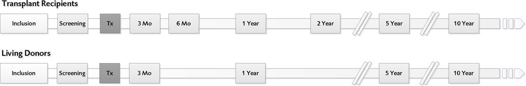 More than 3,500 participants (transplant recipients and living kidney/liver donors) were included, but inclusion is ongoing. Depending on time of enrollment, patients have only one study visit, or multiple visits before and after transplantation.
